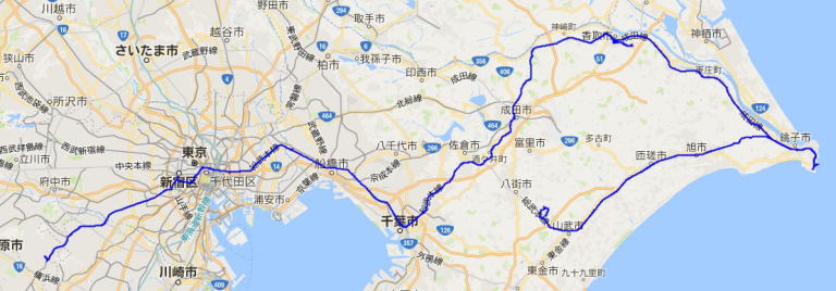 玉川学園前-新宿-市川(キップ購入)-成田-佐原-(散策)-銚子-外川-犬吠-(散策)-銚子-日向 (泊)