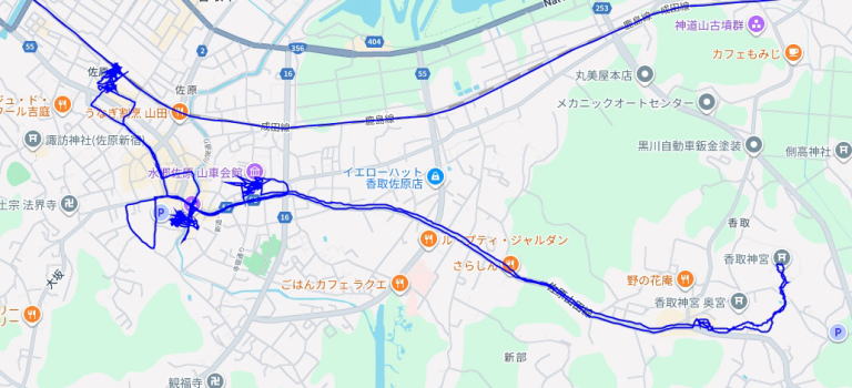 (佐原散策。 GPSロガーのログデータで実際に移動した場所の軌跡を表示)