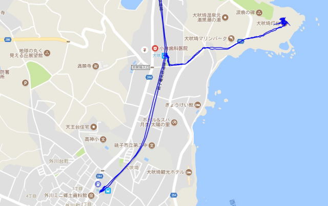 (犬吠駅周辺散策。 GPSロガーのログデータで実際に移動した場所の軌跡を表示)