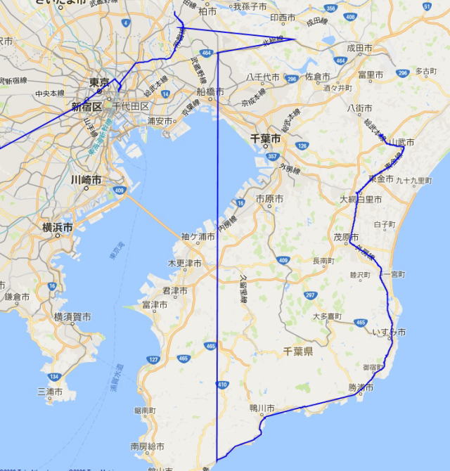 青色が実際に移動した軌跡。 ただし、安房鴨川-千葉間はGPSデータ取得失敗)