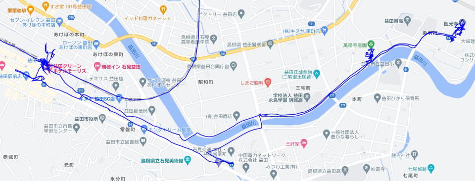(益田市内の散策。 GPSロガーのログデータで実際に移動した場所の軌跡を表示)