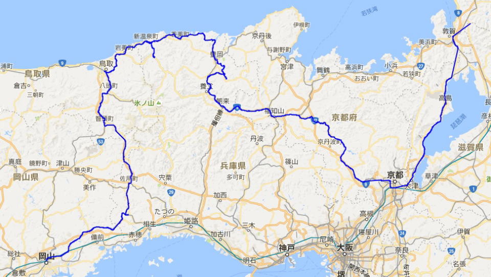 岡山-鳥取-浜坂-湯村温泉(散策)-浜坂-豊岡-出石(散策)-江原-福知山-京都-敦賀(泊)