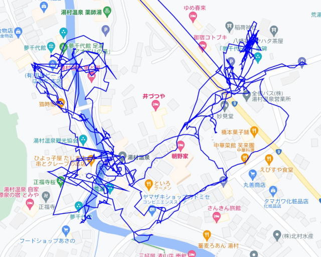 (湯村温泉の散策。 GPSロガーのログデータで実際に移動した場所の軌跡を表示)