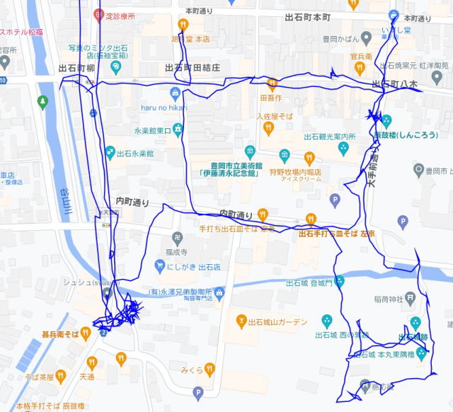 (出石散策。 GPSロガーのログデータで実際に移動した場所の軌跡を表示)
