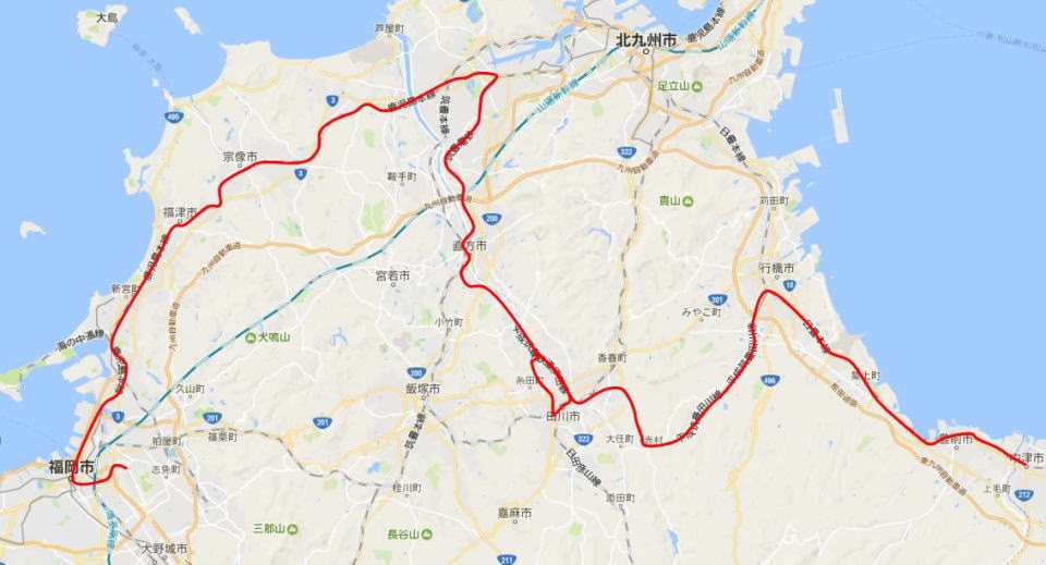 (1日目の行程。 GPSロガーが不調だったので、この日移動した福岡空港から中津駅までをグーグルマップ上に赤色で表示した。)