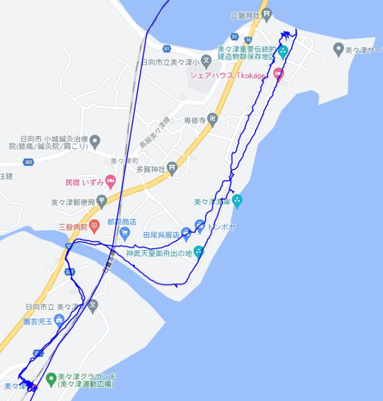 (美々津の散策。 GPSロガーのログデータで実際に移動した場所の軌跡を表示)