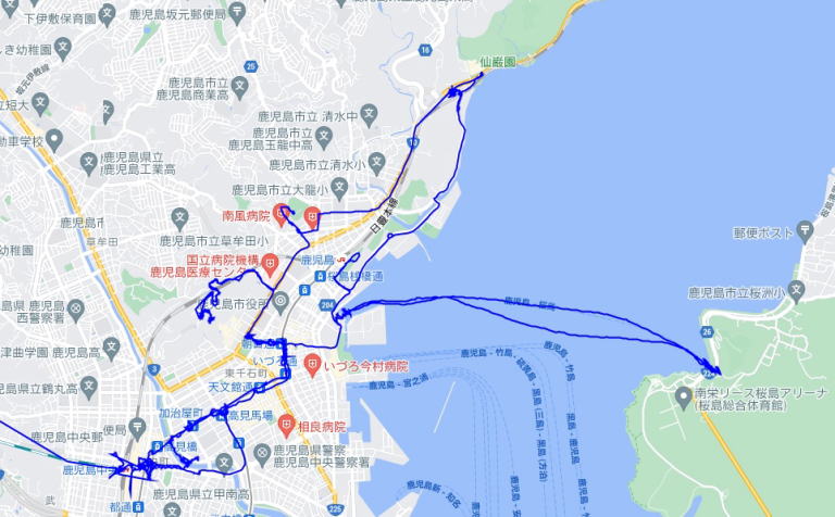 (鹿児島市内の散策。 GPSロガーのログデータで実際に移動した場所の軌跡を表示)
