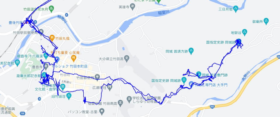 (竹田市内の散策。 GPSロガーのログデータで実際に移動した場所の軌跡を表示)
