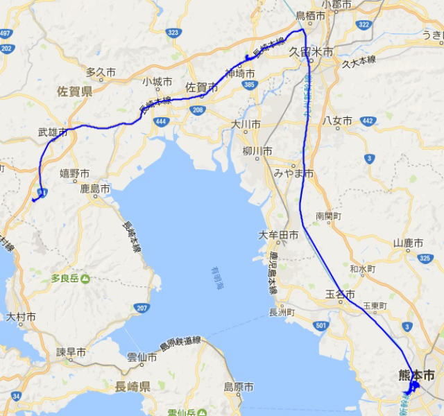 嬉野温泉BT(路線バス)-嬉野温泉-武雄温泉-佐賀-吉野ヶ里公園(吉野ヶ里遺跡散策)-新鳥栖-熊本(泊)