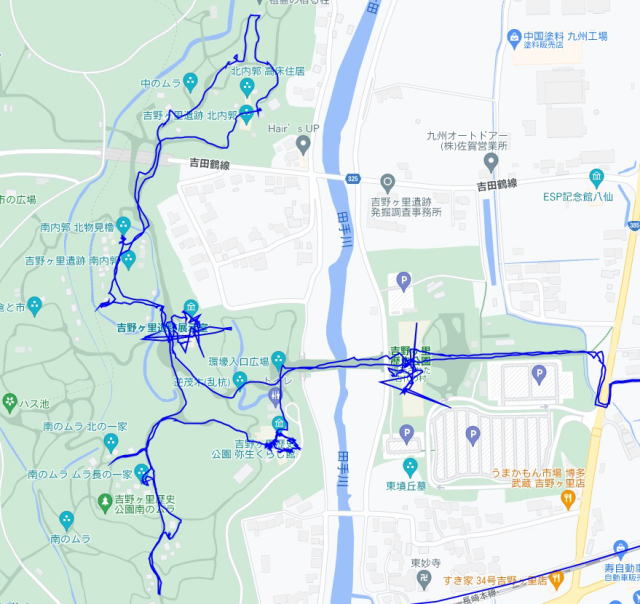 (吉野ヶ里歴史公園の散策。 GPSロガーのログデータで実際に移動した場所の軌跡を表示)