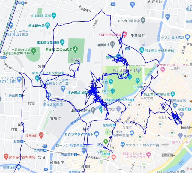 (熊本市内の散策。 GPSロガーのログデータで実際に移動した場所の軌跡を表示)