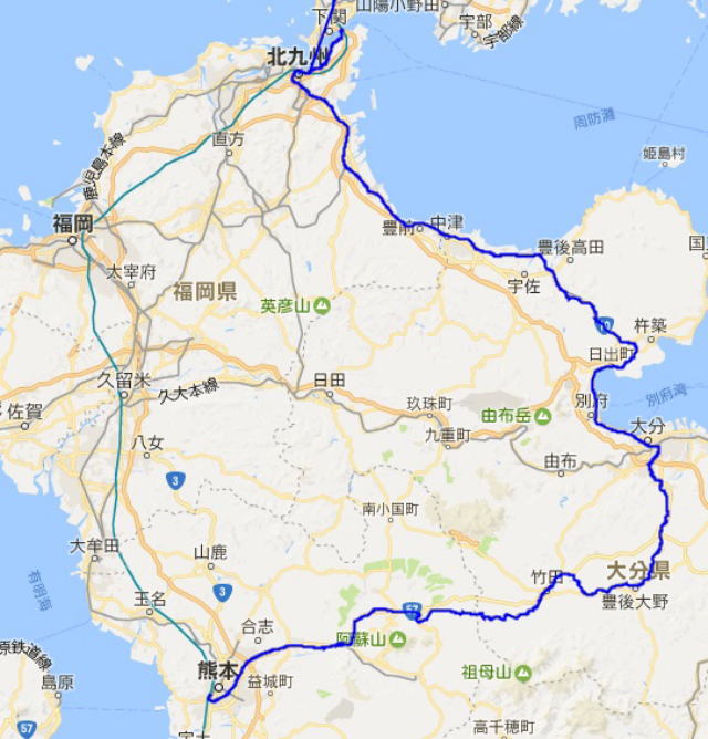 青色が実際に移動した軌跡。 ただし、小倉-町田間は省略)