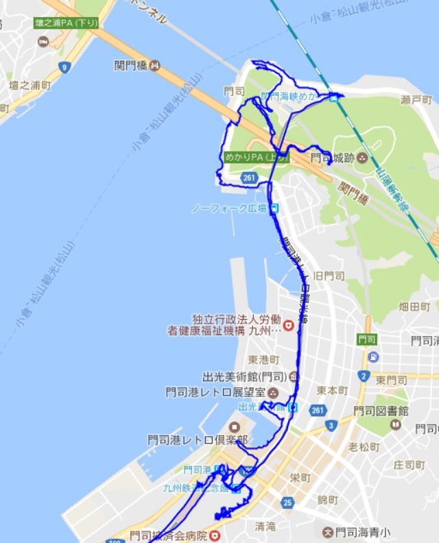 (門司港駅周辺の散策。 GPSロガーのログデータで実際に移動した場所の軌跡を表示)