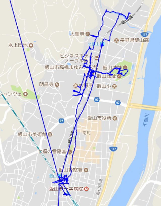 (飯山市散策。 GPSロガーのログデータで実際に移動した場所の軌跡を表示)