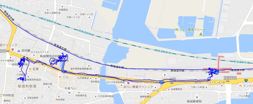 (新居関所とその周辺の散策。 GPSロガーのログデータで実際に移動した場所の軌跡を表示)