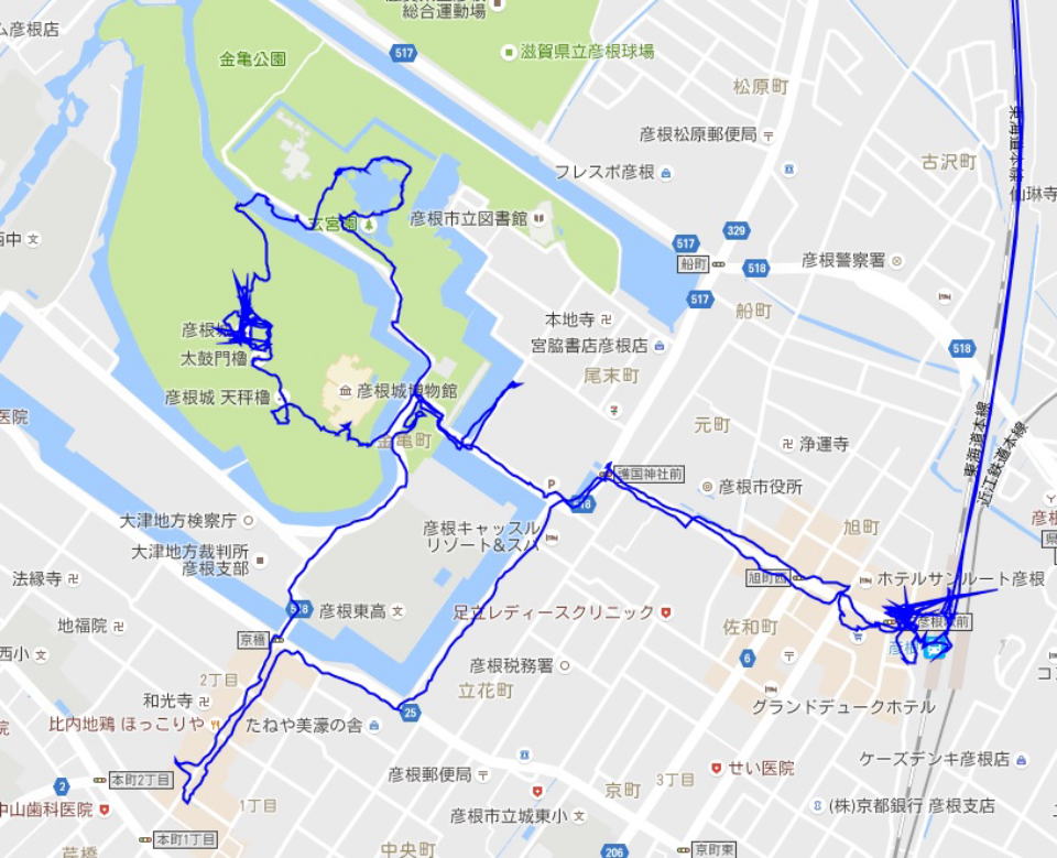 (彦根城と彦根市内の散策。 GPSロガーのログデータで実際に移動した場所の軌跡を表示)