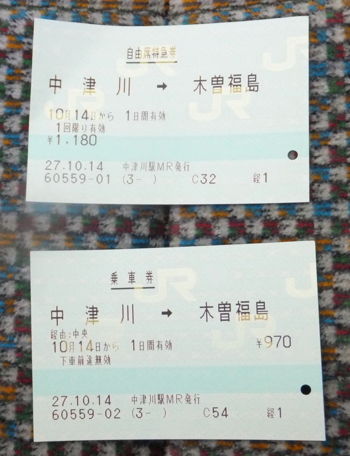 利用し、木曽福島での滞在時間を2時間確保する事にした。「秋の乗り放題パス」では特急電車に乗車するには乗車券も別購入する必要があるので、