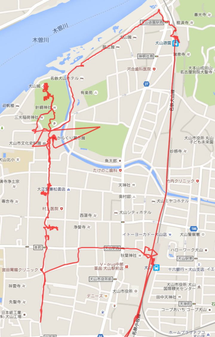 (犬山散策 GPSロガーのログデータで実際に移動した場所の軌跡を表示)
