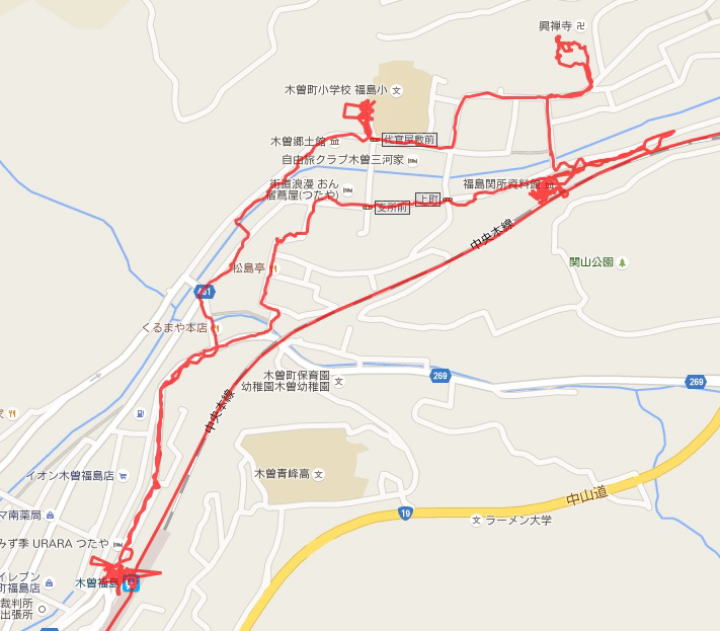 (木曽福島散策 GPSロガーのログデータで実際に移動した場所の軌跡を表示)
