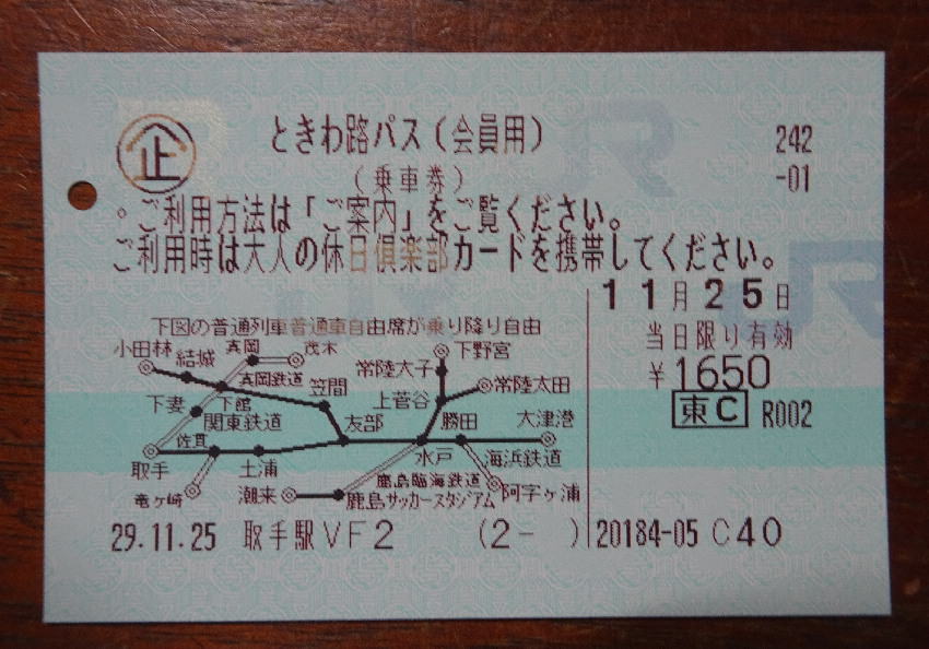 取手駅の自動券売機で大人の休日倶楽部会員用の「ときわ路パス」を購入後、最初に取手からJR水戸線の下館を結ぶ