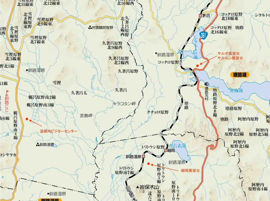 釧路市内 → 塘路(サルボ展望台、サルルン展望台)→ 茅沼(シラルトロ湖、蝶の森)→ 達古武湖 → 細岡展望台 → 温根内ビジターセンター(散策路)