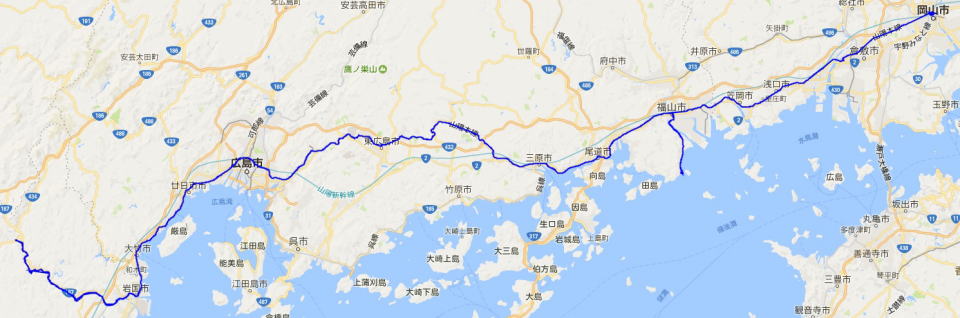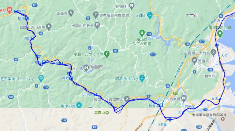 (岩国-錦町間。 GPSロガーのログデータで実際に移動した場所の軌跡を表示)