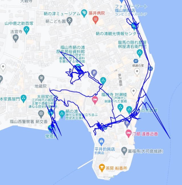 (鞆の浦の散策。 GPSロガーのログデータで実際に移動した場所の軌跡を表示)