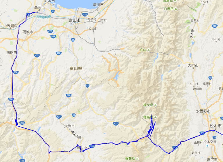 青色が実際に移動した軌跡。 ただし、松本-東京間は省略)