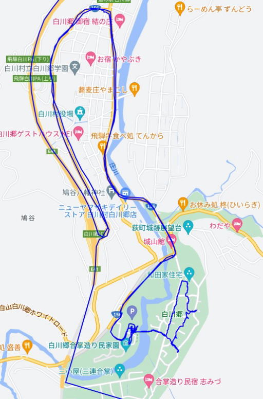 (白川郷散策。 GPSロガーのログデータで実際に移動した場所の軌跡を表示)