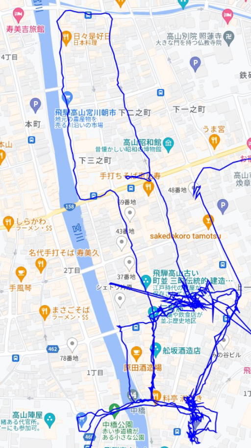(高山市内散策。 GPSロガーのログデータで実際に移動した場所の軌跡を表示)