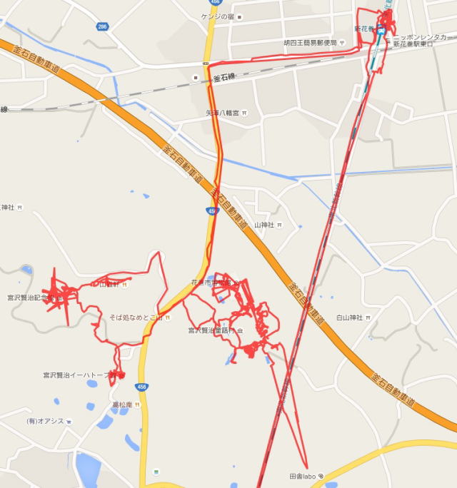 (花巻散策。 GPSロガーのログデータで実際に移動した場所の軌跡を表示)