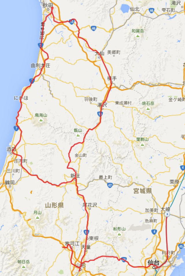 古川 - 仙台 - 北山形 - 左沢 - 山形 - 新庄 - 大曲 - 秋田 - 余目 - 新庄 新庄(泊)