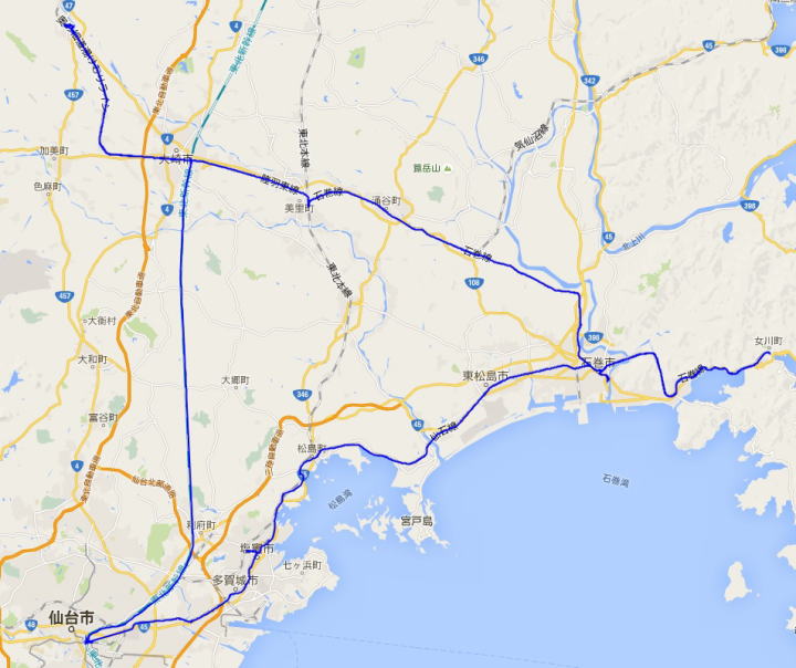 青色が実際に移動した軌跡。 ただし、仙台から自宅までのルートは省略。)