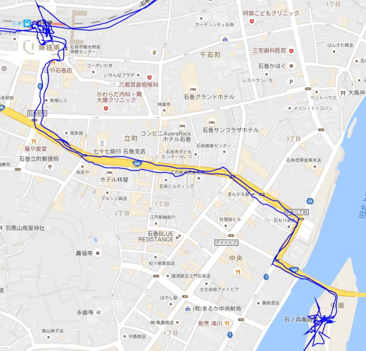 (石巻市内散策。 GPSロガーを使って、ログデータから実際に移動した場所を表示。)