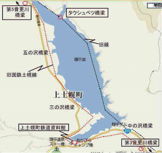 旧国鉄士幌線は旧線と新線があり、タウシュベツ川橋梁は旧線の鉄道遺産である。糠平ダムを建設すると旧線の一部は水没して