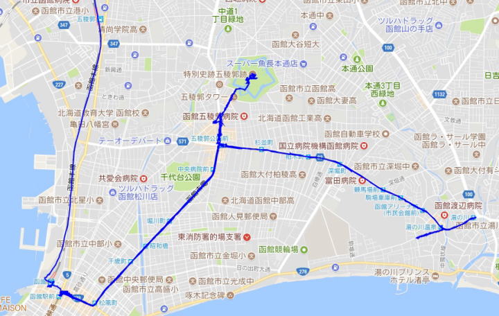(函館市内散策。 GPSロガーのログデータで実際に移動した場所の軌跡を表示)