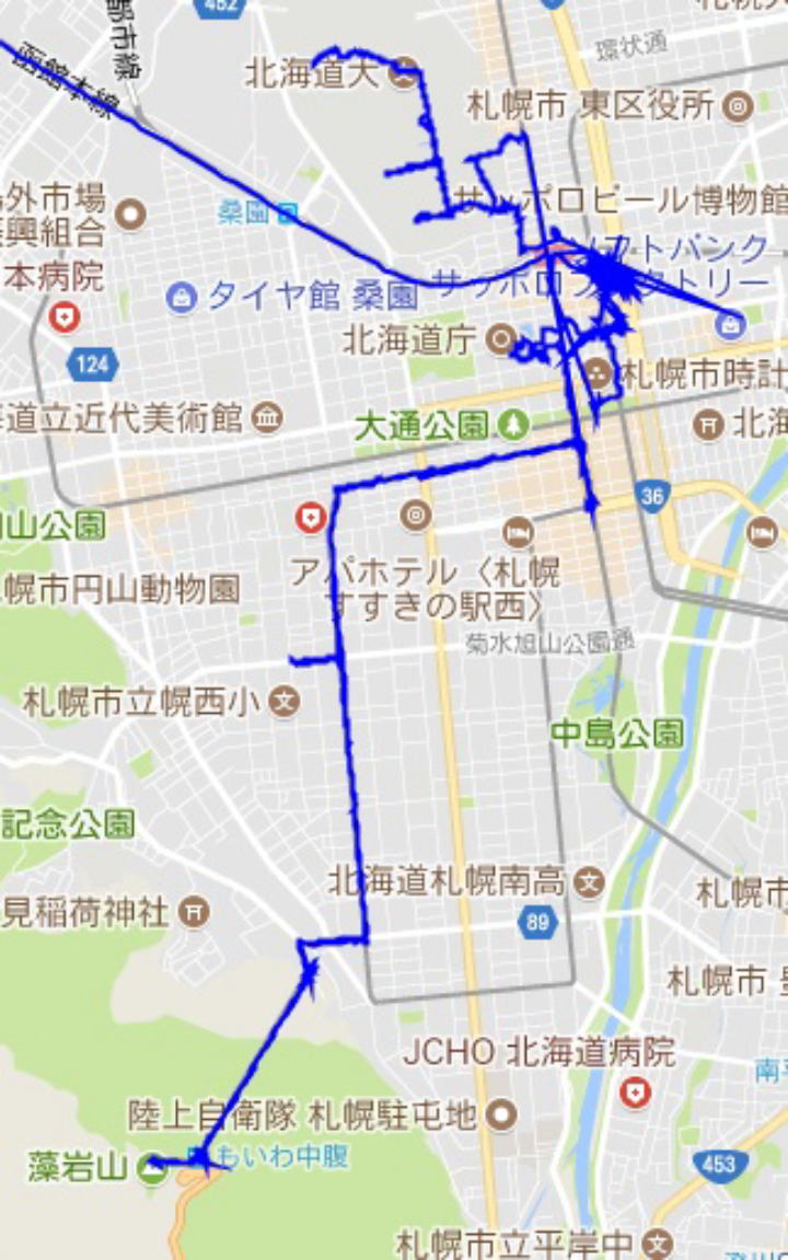 (札幌市内散策。 GPSロガーのログデータで実際に移動した場所の軌跡を表示)