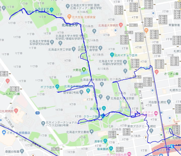 (北海道大学構内の散策。 GPSロガーのログデータで実際に移動した場所の軌跡を表示)