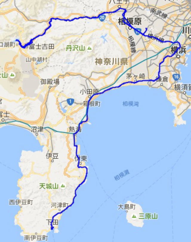 相模大野-小田原-熱海-伊豆急下田(下田市内散策)-横浜-八王子-高尾-大月-河口湖(河口湖散策)-八王子-町田(自宅)