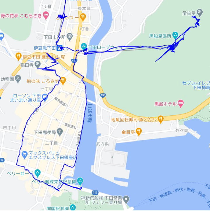 (下田市内散策。 GPSロガーのログデータで実際に移動した場所の軌跡を表示)