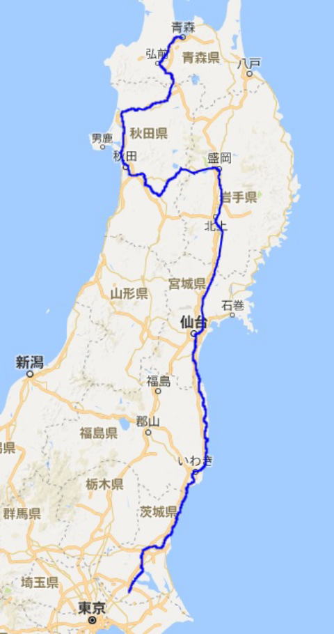 新宿-上野-仙台(常磐線経由)-秋田-青森(泊)