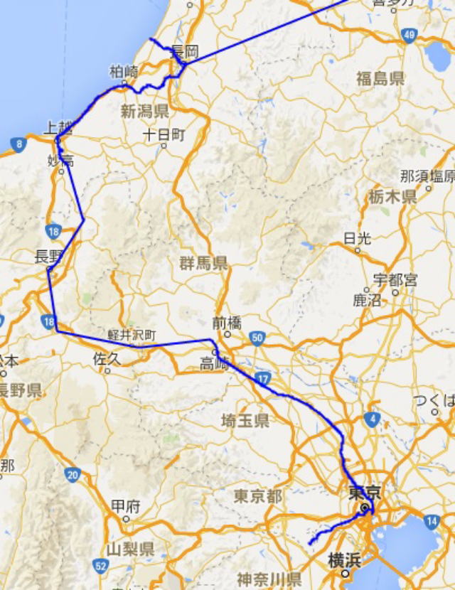 青色が実際に移動した軌跡。 ただし、長岡→大宮→福島→仙台 間は、新幹線車内で