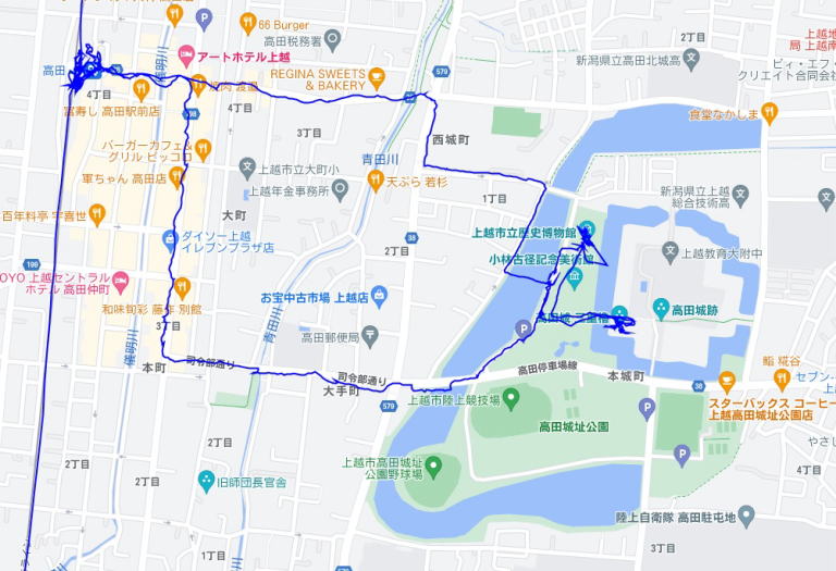 (高田城址公園周辺散策。 GPSロガーのログデータで実際に移動した場所の軌跡を表示)