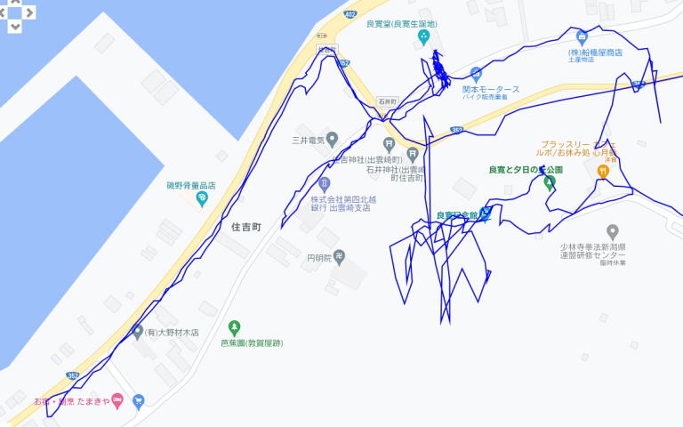 (出雲崎周辺散策。 GPSロガーのログデータで実際に移動した場所の軌跡を表示)