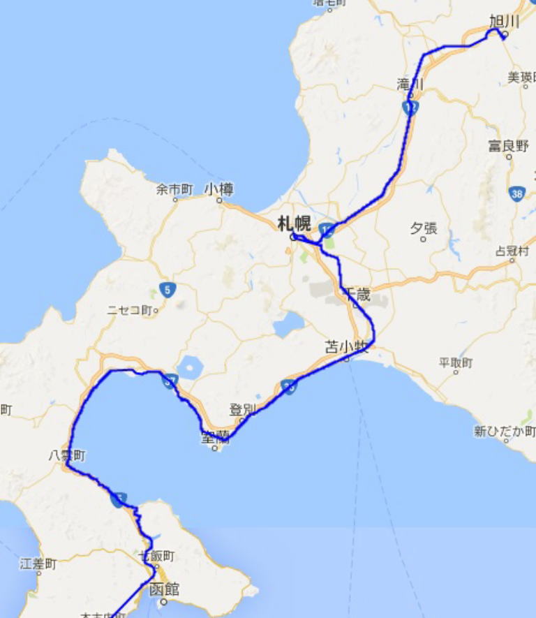 青色が実際に移動した軌跡。 ただし、東京-新函館北斗間は省略)