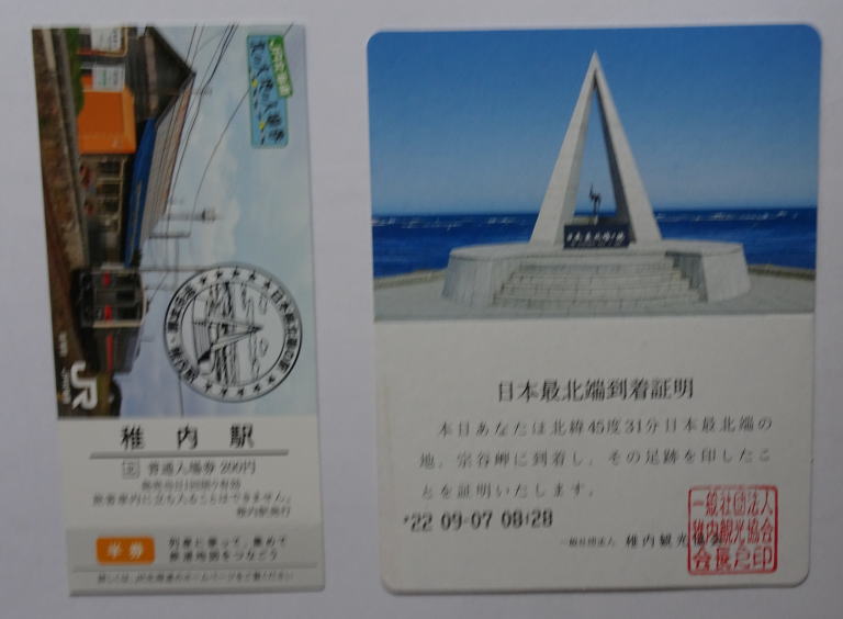 日本最北端の駅(稚内駅)の入場券と日本最北端の地(宗谷岬)到達証明書