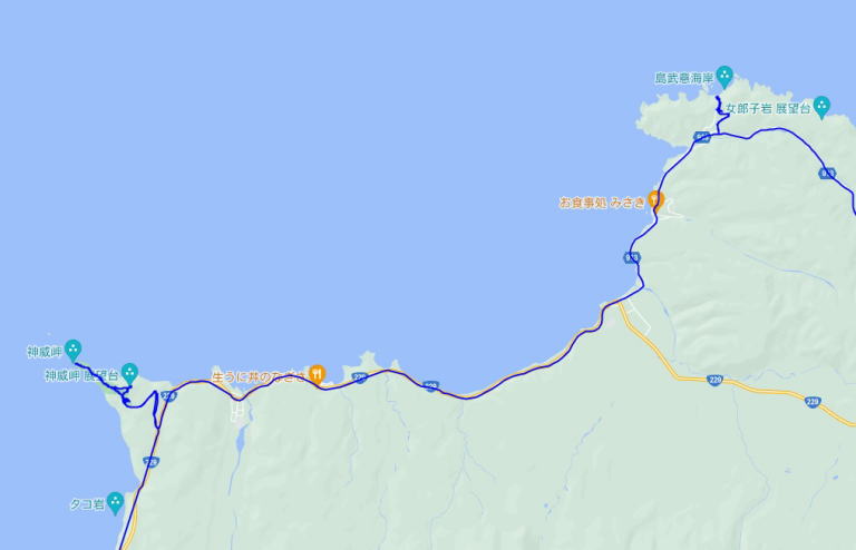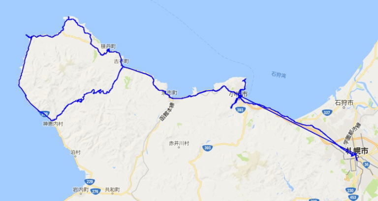(神威岬・積丹岬周辺の散策。 GPSロガーのログデータで実際に移動した場所の軌跡を表示)
