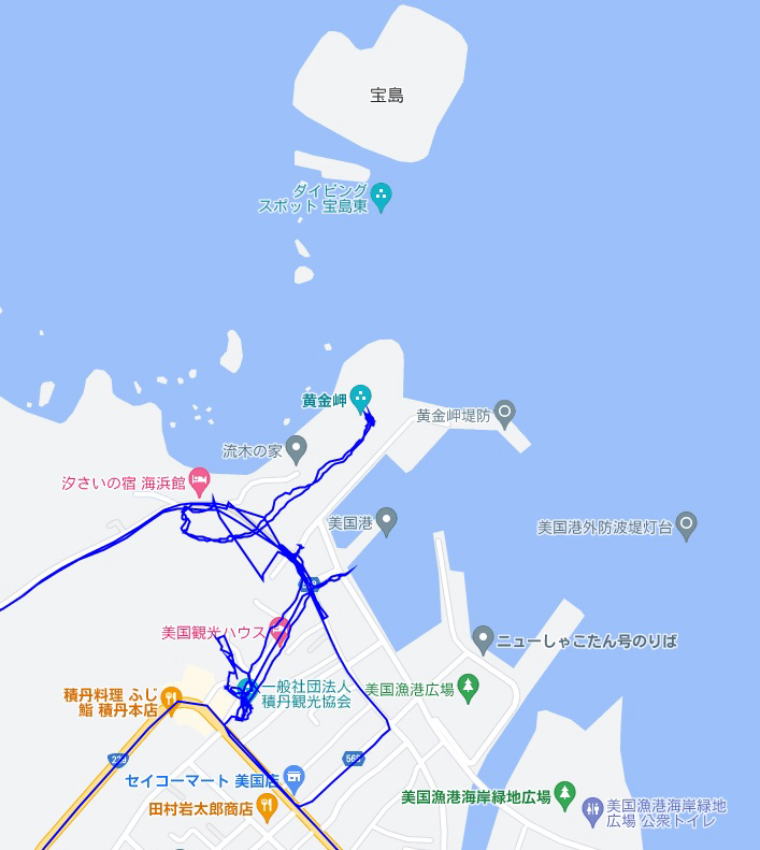(黄金岬周辺の散策。 GPSロガーのログデータで実際に移動した場所の軌跡を表示)