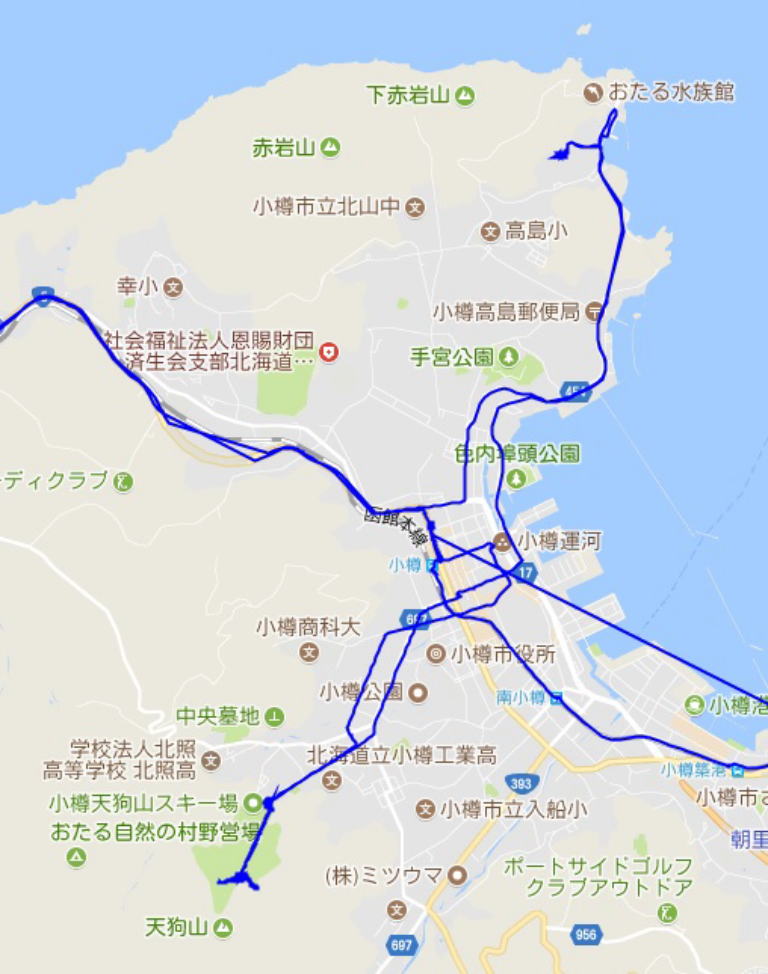 (小樽市内の散策。 GPSロガーのログデータで実際に移動した場所の軌跡を表示)