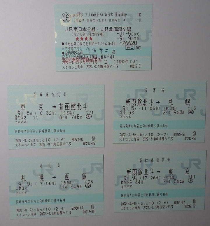 フリーキップを使って9月5日(月)~9月9日(金)の4泊5日の北海道旅を計画した。